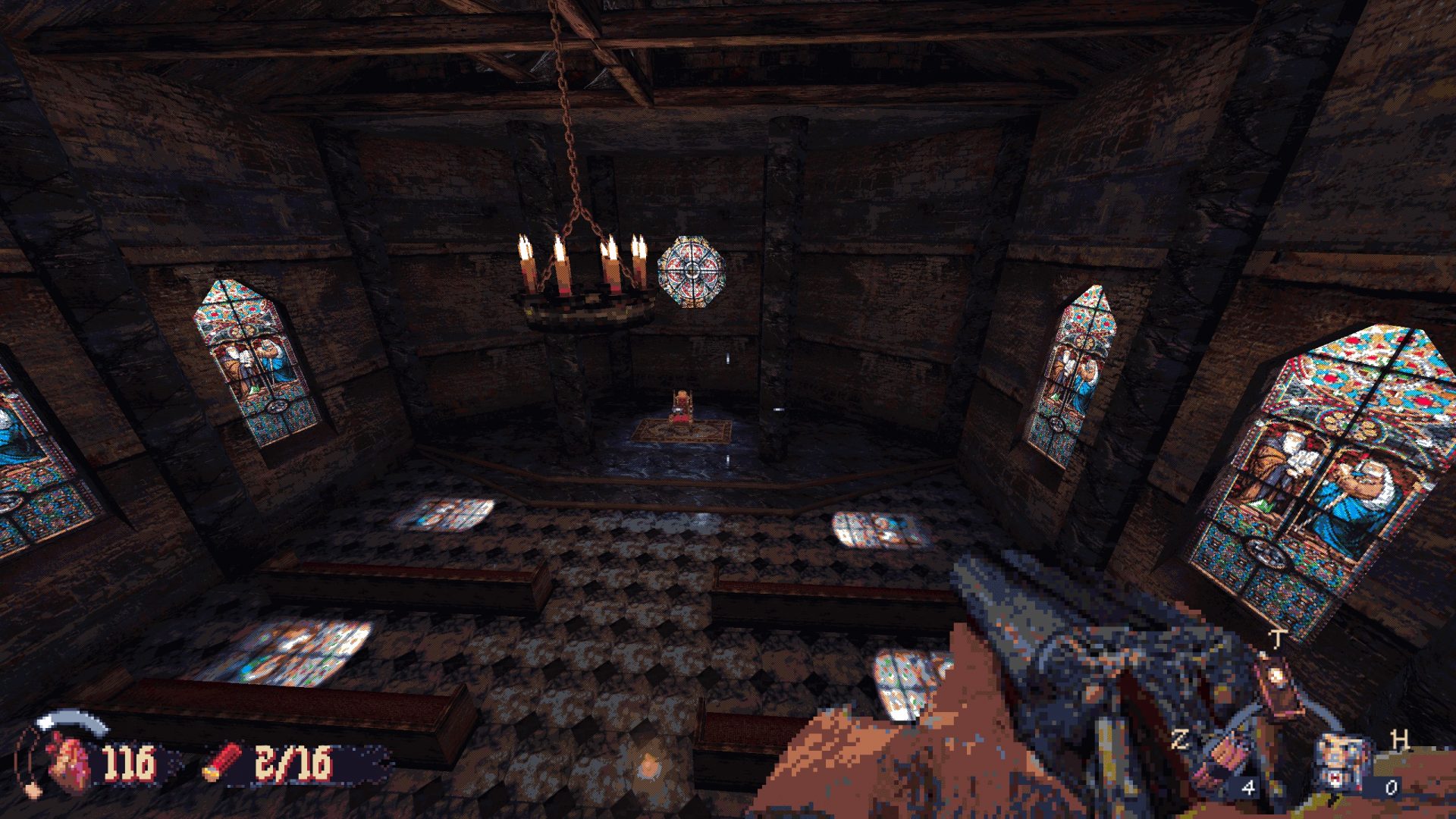 Карты в Cultic представляют собой обширные лабиринты, каждый со своей фишкой и уникальным геймплеем. Уровень с поездом, рождественская деревня, торговый центр и пародия на особняк Спенсера из Resident Evil — все они заслуживают особого внимания. Моя единственная претензия заключается в том, что вторая глава стала немного затянутой и перегруженной, особенно финальный уровень. А вот первая глава выдержана идеально по темпу.