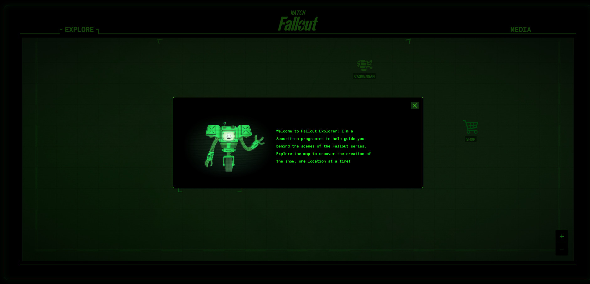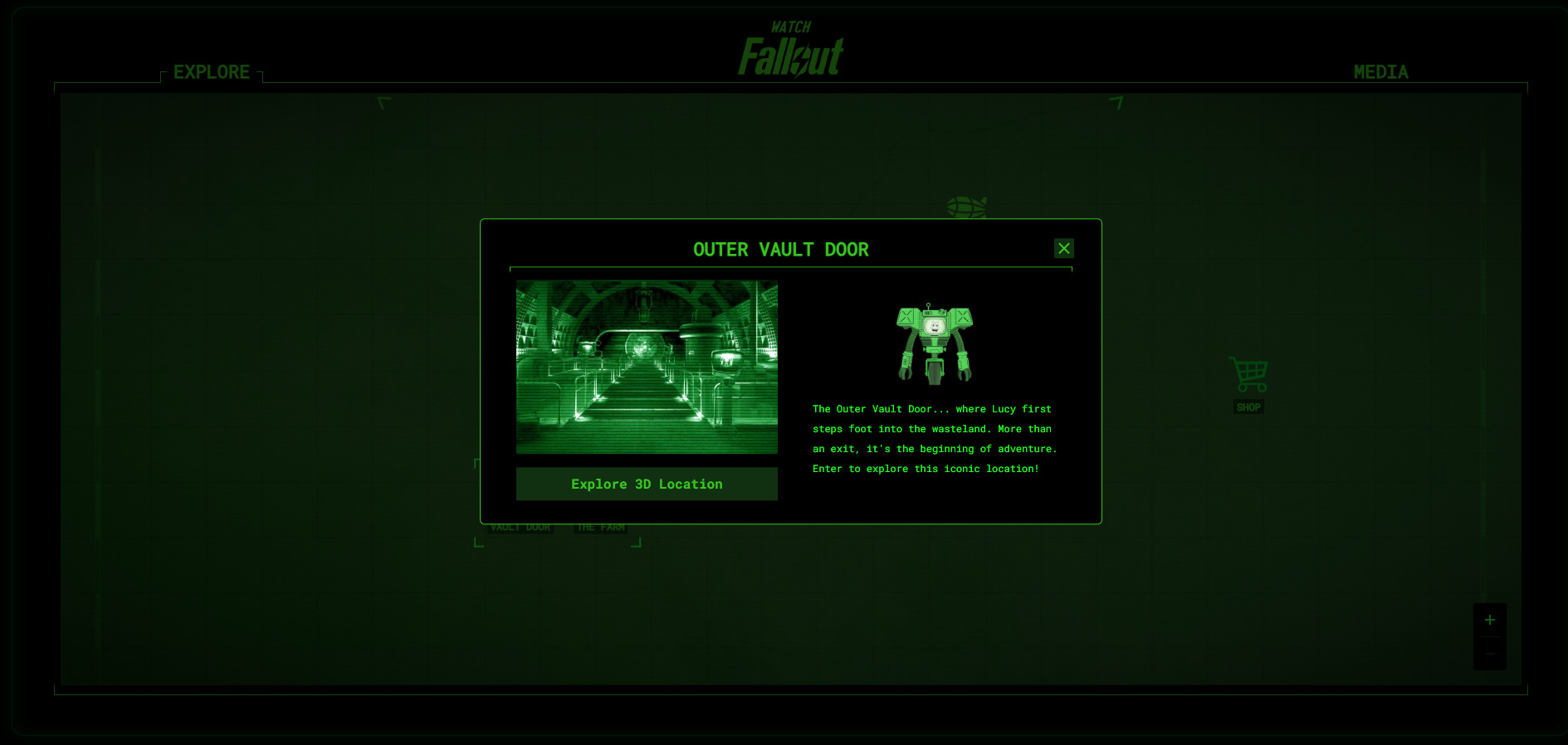 Увы, таймер вовсе не предназначался для показа чего-то новенького по Fallout. Он скрывал «программу» Fallout Explorer — путеводитель по закулисью съёмок сериала «Фоллаут». Фанаты могут перемещаться по «карте» и исследовать места, показанные в шоу. Например, Убежище 33 или пентхаус Мистера Хауса.